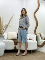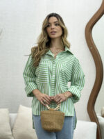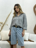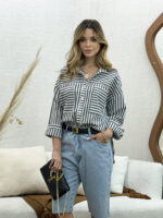 Camisa listrada ampla com bolsos frontais traz tecido leve de ótimo caimento, que une conforto e elegância ao dia a dia. O corte solto garante liberdade de movimento, enquanto o comprimento alongado valoriza o visual com modernidade. As listras verticais e horizontais criam contraste sofisticado, deixando a peça versátil e fácil de combinar.
