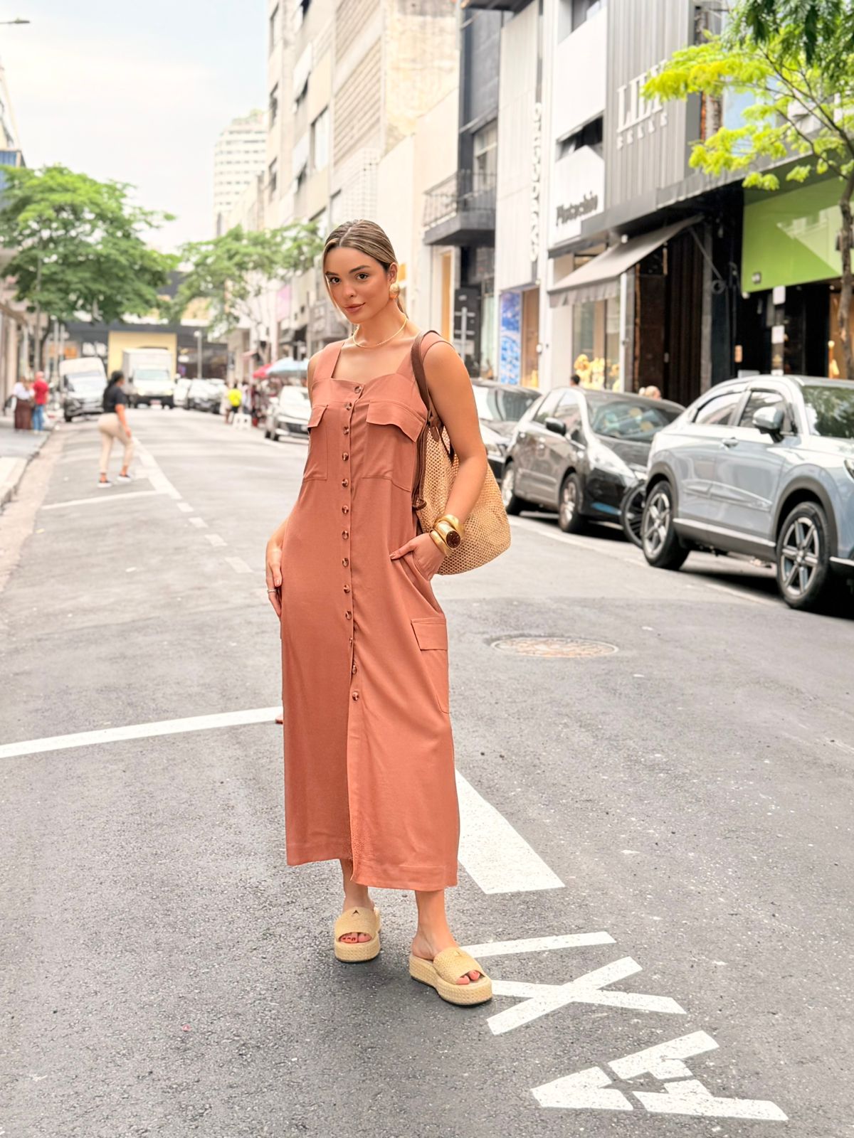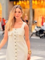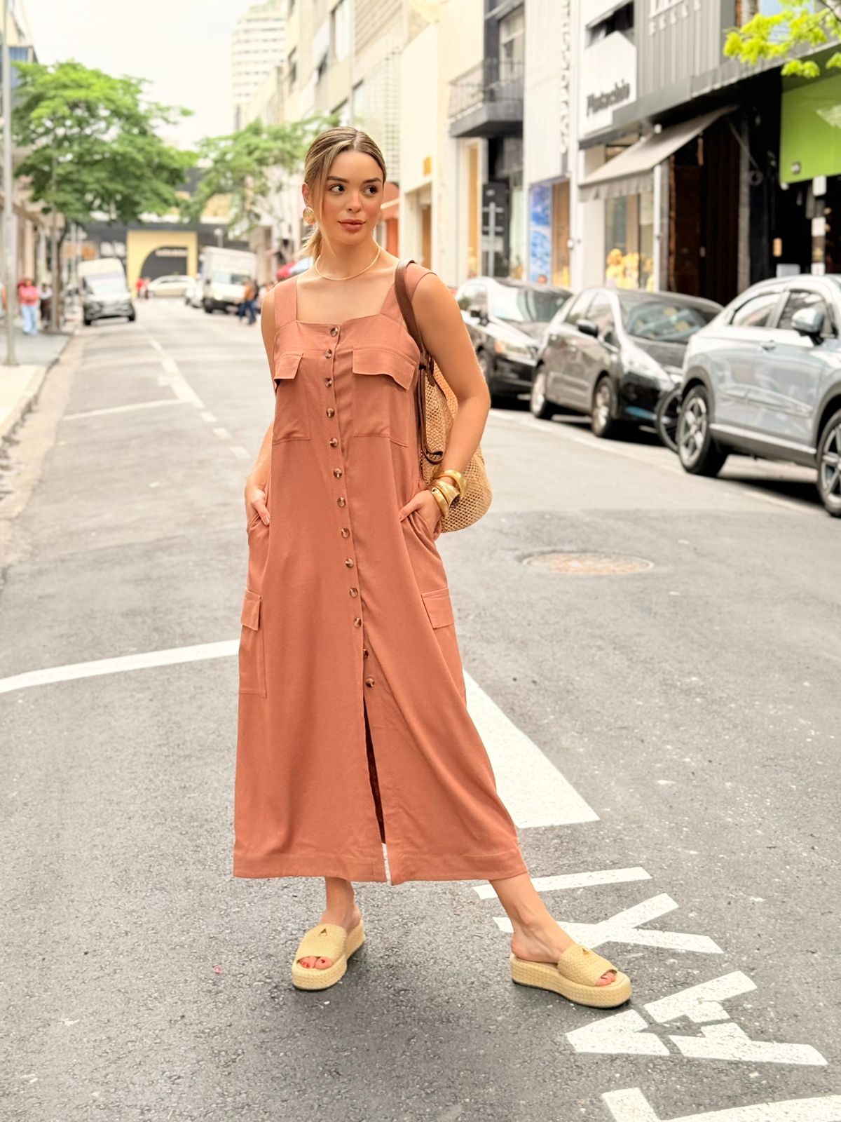O chemise regata é confeccionada em linho, um tecido nobre que oferece frescor, leveza e um caimento naturalmente sofisticado. Seu design alongado com abotoamento frontal cria uma linha vertical que valoriza a silhueta, enquanto os bolsos frontais adicionam charme utilitário e funcionalidade ao look. O modelo combina praticidade e estilo em uma peça versátil, perfeita para transmitir elegância descomplicada no dia a dia.