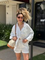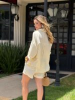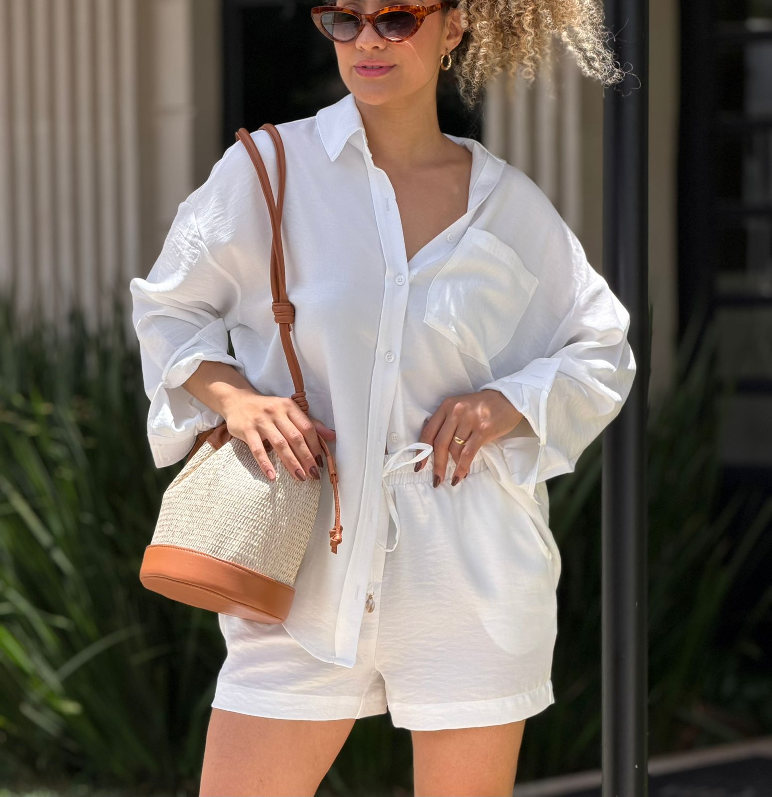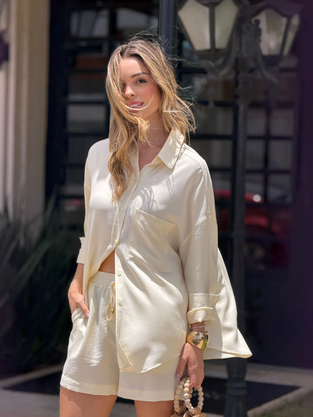 Conjunto feminino composto por camisa ampla e shorts, desenvolvido em tecido leve, fresco e confortável. A camisa possui modelagem ampla, caimento solto e toque macio, proporcionando leveza ao vestir e valorizando a silhueta de forma natural. O design clean e atemporal garante elegância sem excessos, além de oferecer versatilidade para diferentes ocasiões.