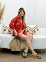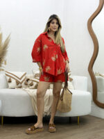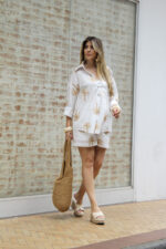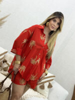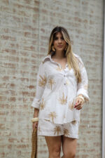Conjunto de camisa e shorts é a combinação perfeita entre leveza, estilo e sofisticação. Confeccionado em tecido leve e confortável, ele apresenta bordados em tom dourado que criam um visual tropical elegante, ideal para dias de verão com um toque refinado. A camisa possui modelagem soltinha, com caimento fluido e botões frontais que garantem conforto e movimento. Já o shorts segue a mesma proposta, oferecendo praticidade e um ajuste agradável ao corpo sem marcar.