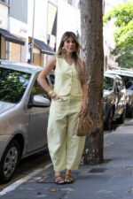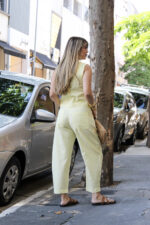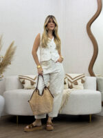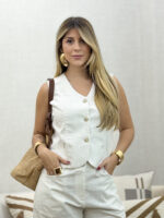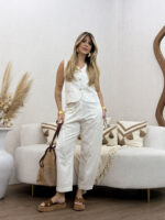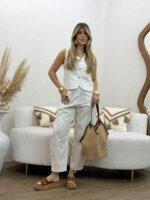 O conjunto de colete e calça balloon em linho valoriza o frescor, a leveza e a elegância natural do tecido. O colete traz corte reto e acabamento minimalista, enquanto os botões frontais acrescentam sofisticação discreta ao visual. A calça, com modelagem balloon, exibe caimento estruturado que realça o corpo com conforto e modernidade.