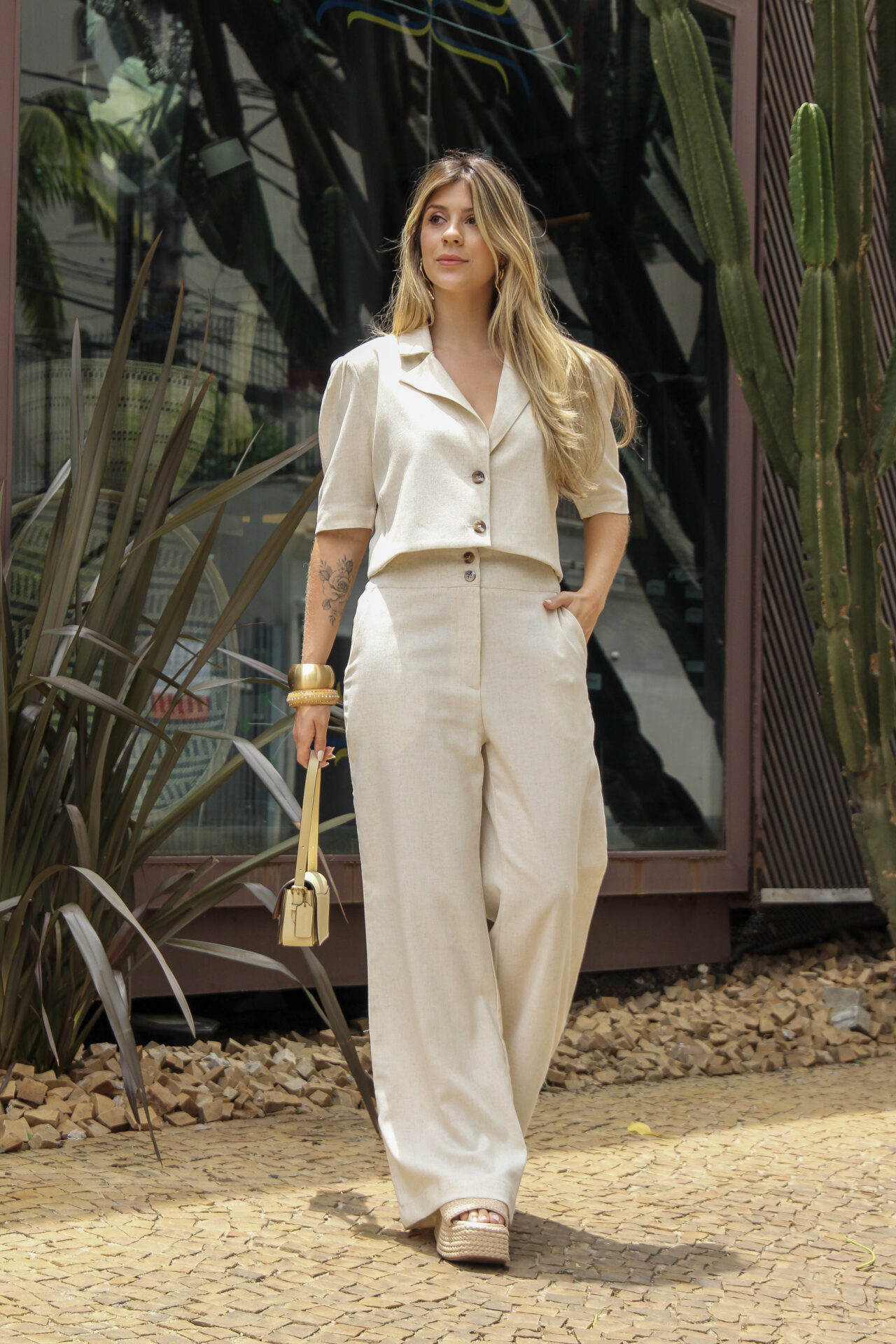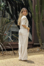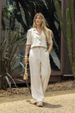 Conjunto em Linho composto por blazer cropped e calça pantalona, perfeito para quem busca um visual elegante e contemporâneo. O blazer, com mangas curtas e ombros levemente estruturados, traz um toque moderno e feminino, valorizando a silhueta com seu caimento impecável e comprimento na medida certa. A calça pantalona apresenta cintura média e bolsos frontais e posteriores funcionais, oferecendo conforto e praticidade com um toque refinado.