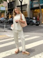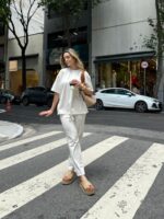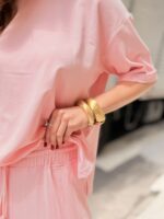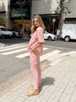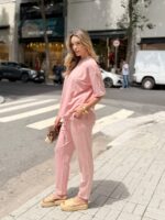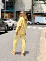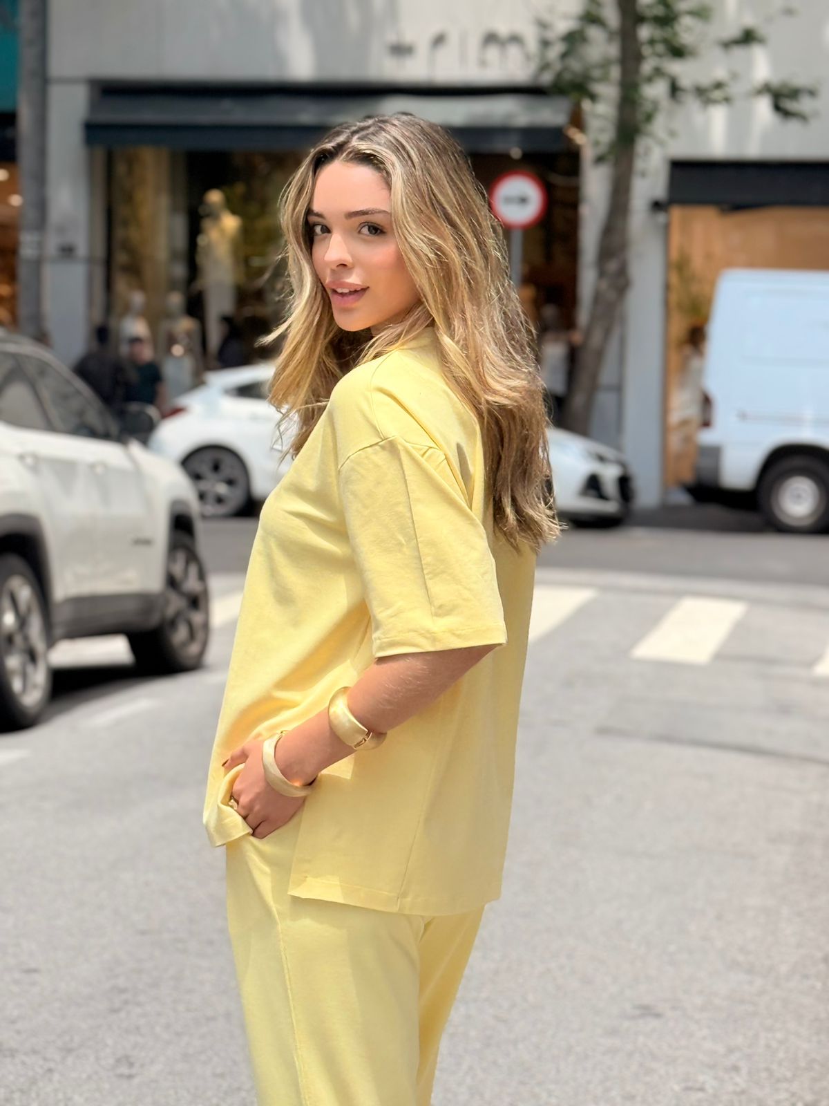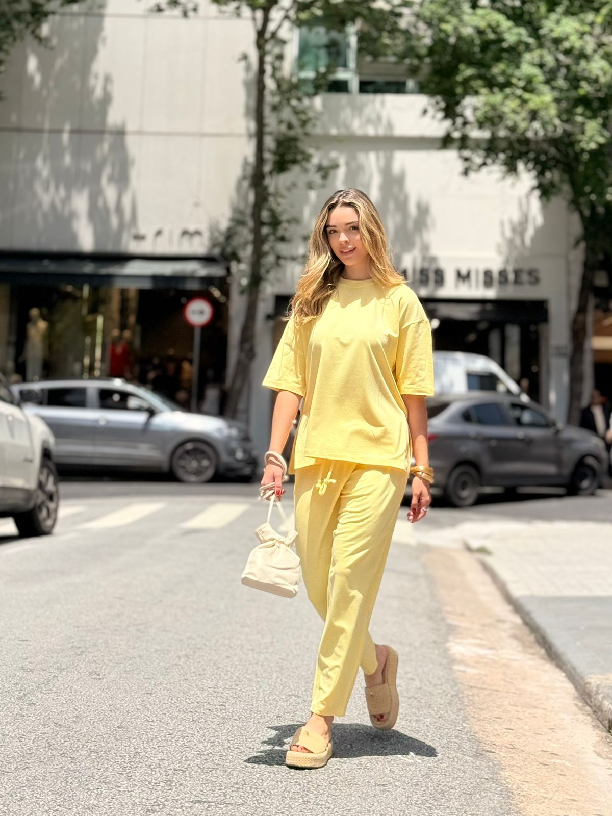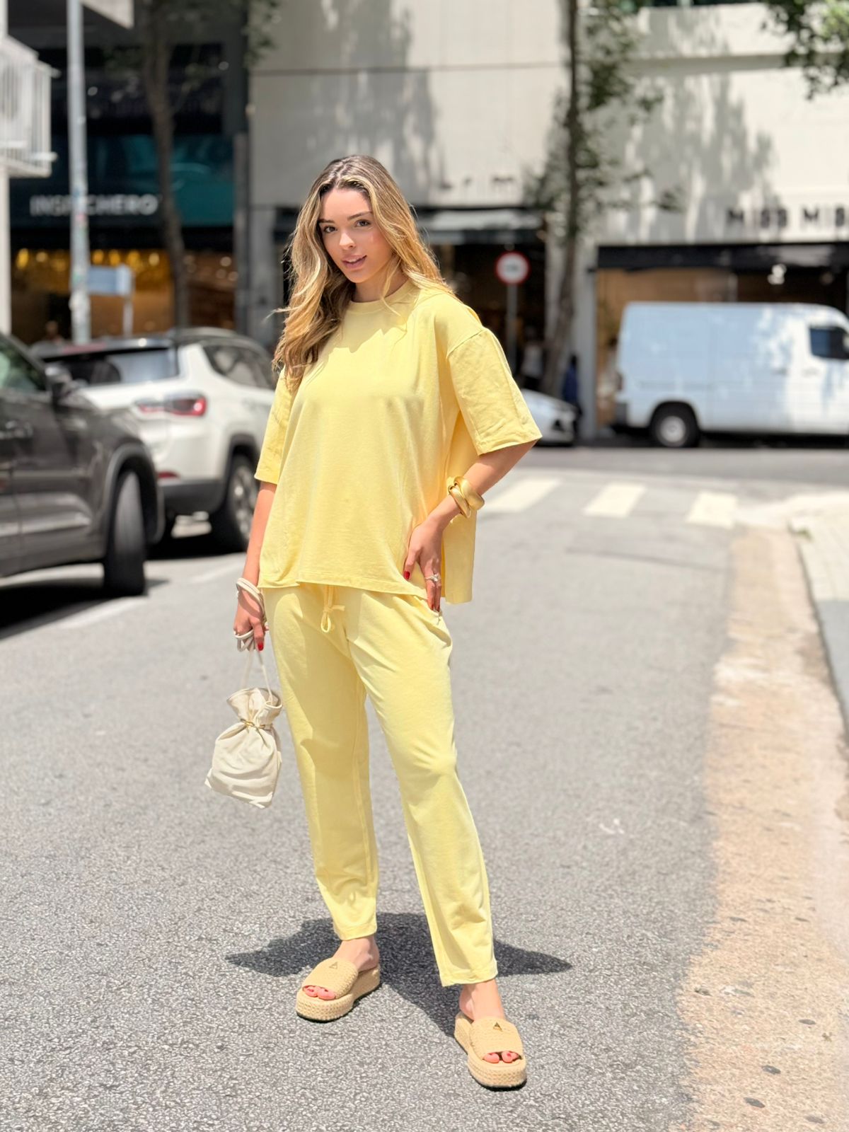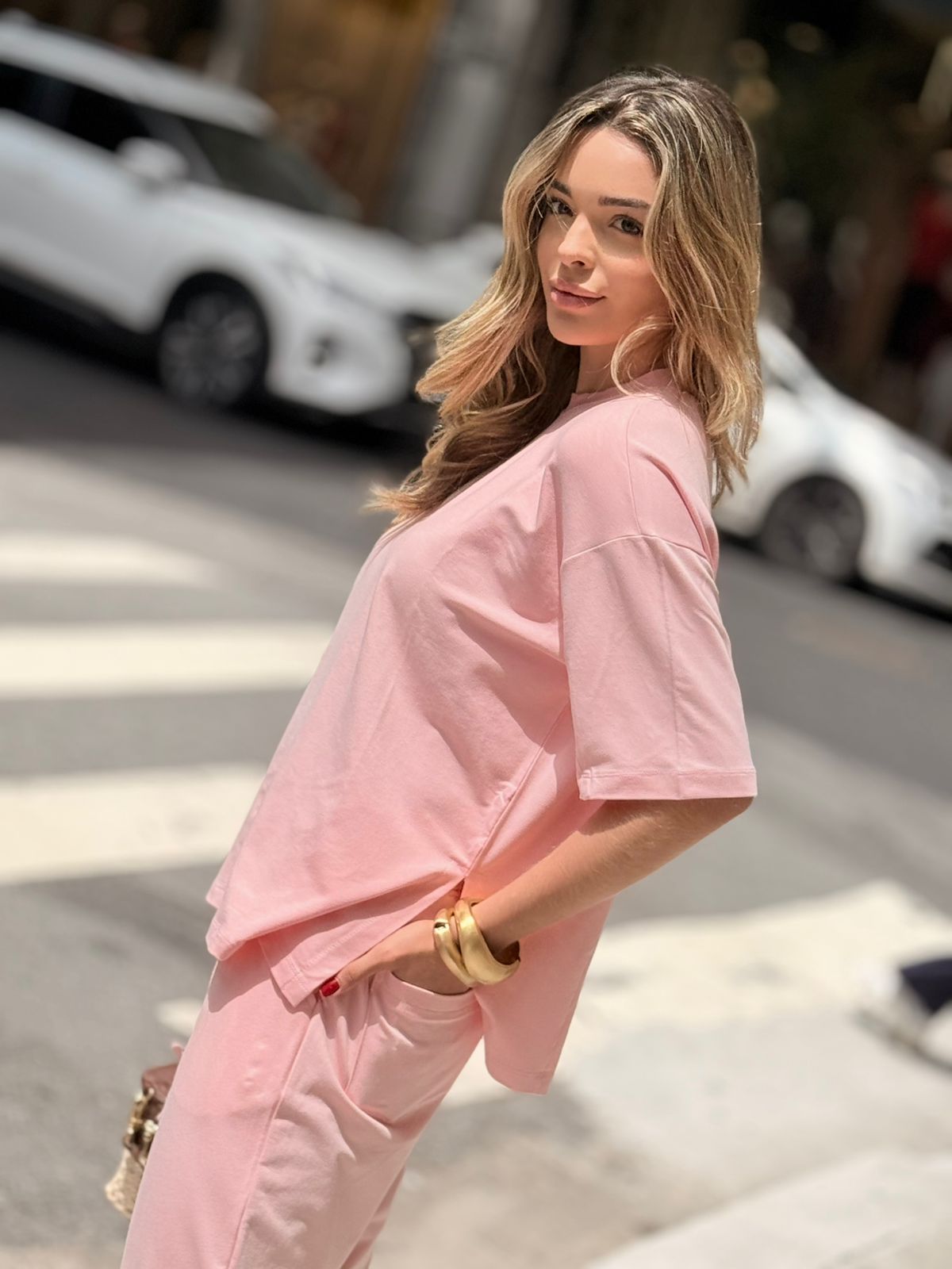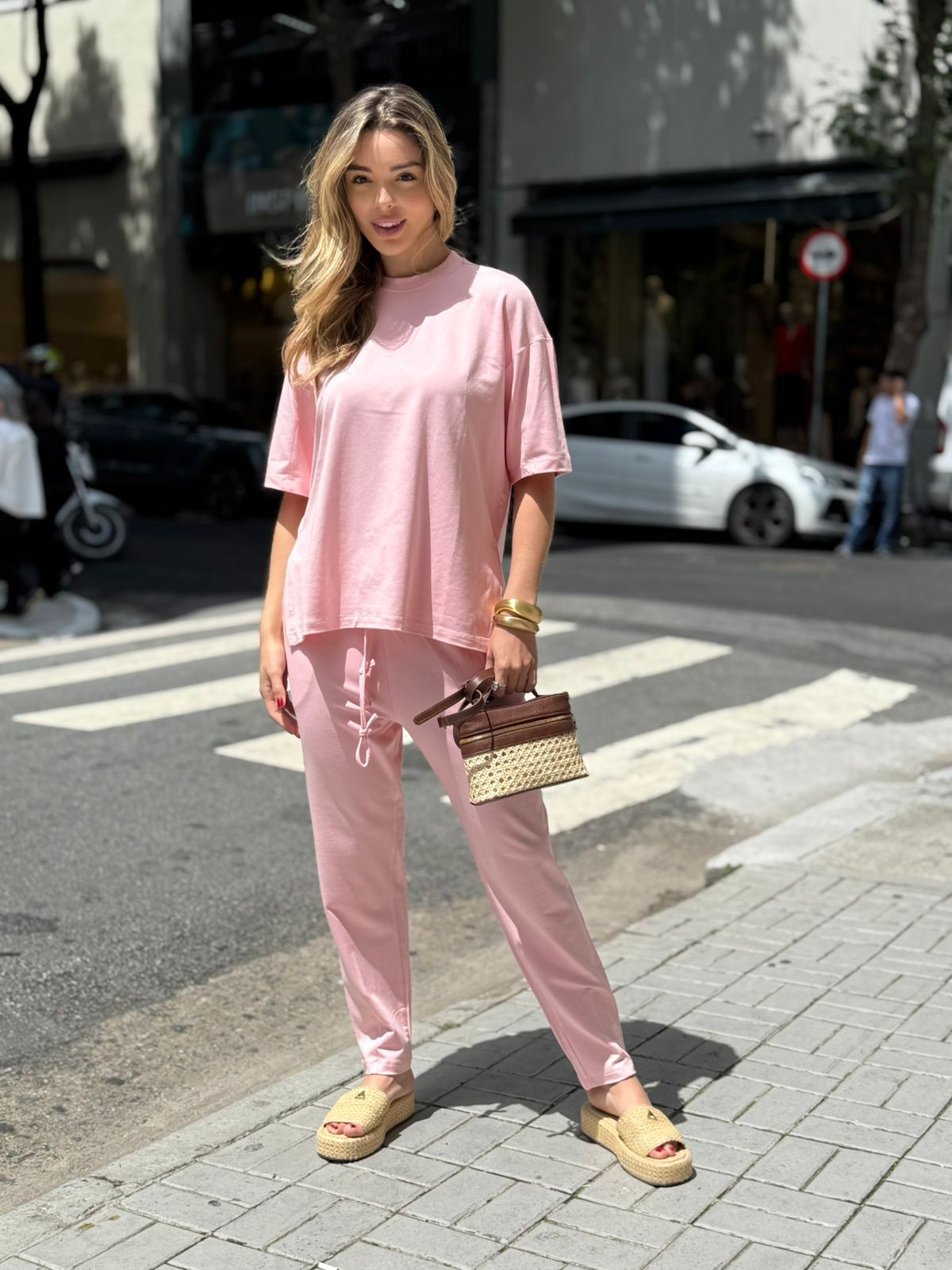 Conjunto de blusa ampla com recorte e calça com elástico no cós. Confeccionado em moletinho, tecido leve e macio de toque aconchegante. O caimento fluido valoriza o corpo com naturalidade. A blusa possui modelagem ampla e recortes laterais que adicionam movimento e modernidade. A calça com cós elástico e amarração garante ajuste confortável e praticidade no dia a dia.