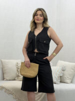 O Conjunto de Colete com Bermuda em linho é aquele tipo de look que combina elegância e conforto de um jeito leve e moderno. Confeccionado em Linho, o tecido tem toque agradável e caimento natural, trazendo frescor e sofisticação ao visual. O colete com zíper e bolsos frontais deixa o look prático, enquanto a bermuda, com bolsos frontais e posteriores, garante um ajuste confortável e valorizador. Um conjunto versátil e cheio de charme, perfeito para quem gosta de se sentir confiante e bem vestida em qualquer ocasião.