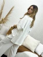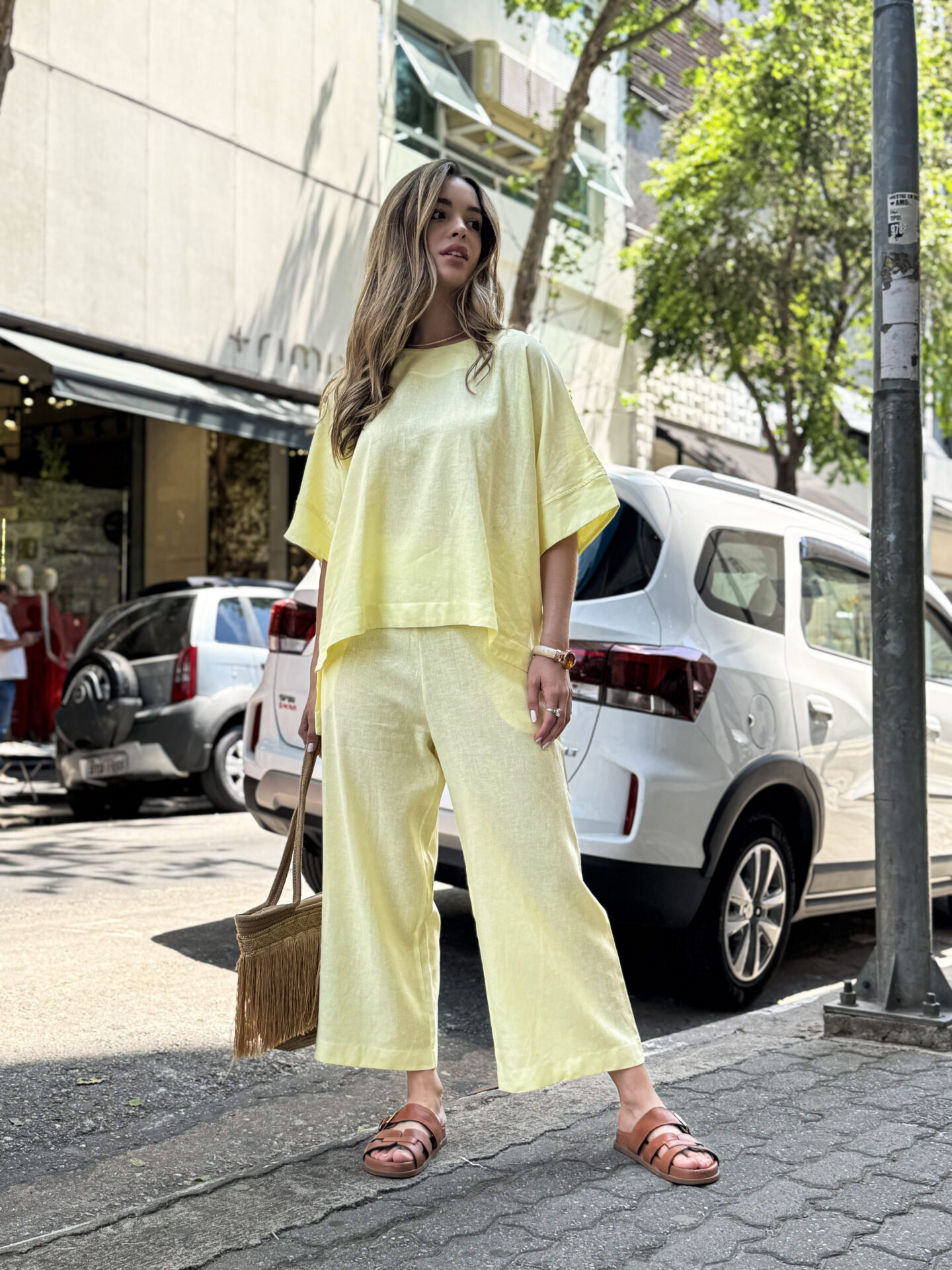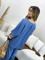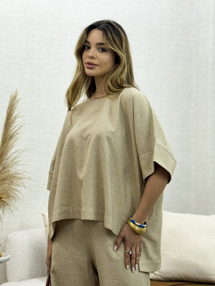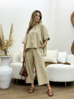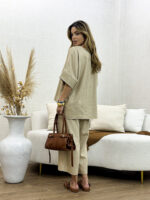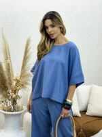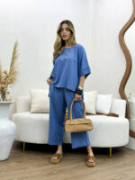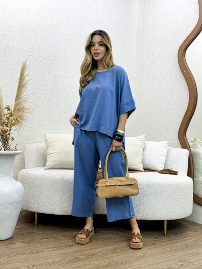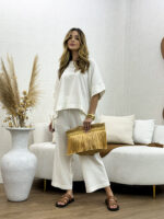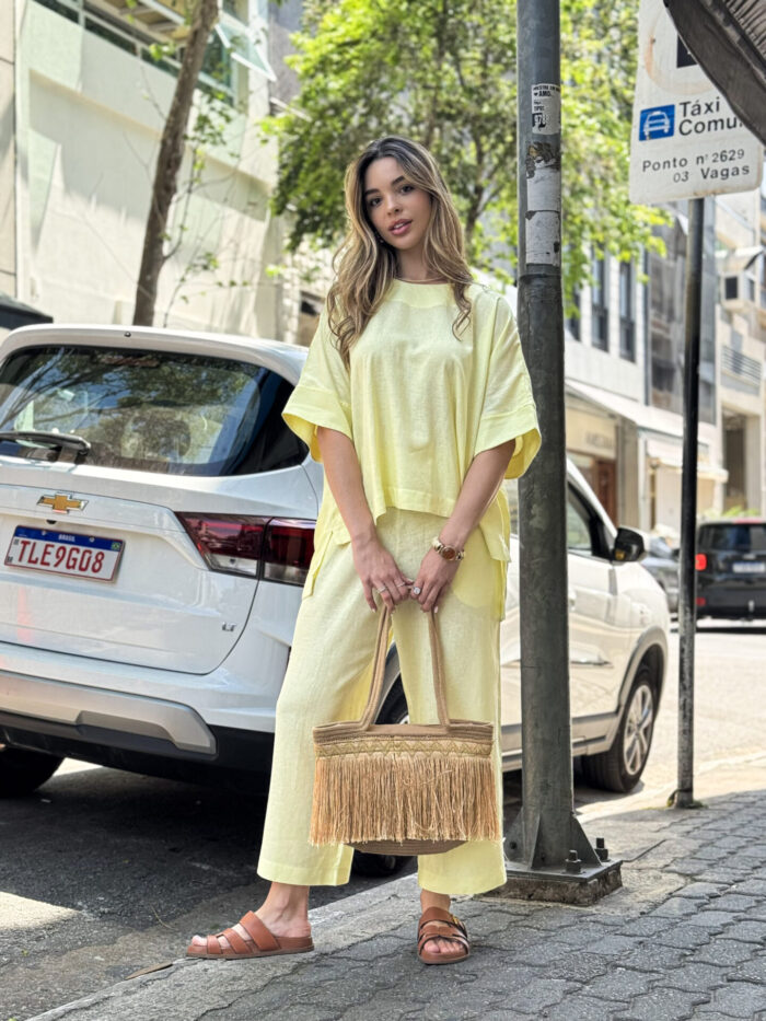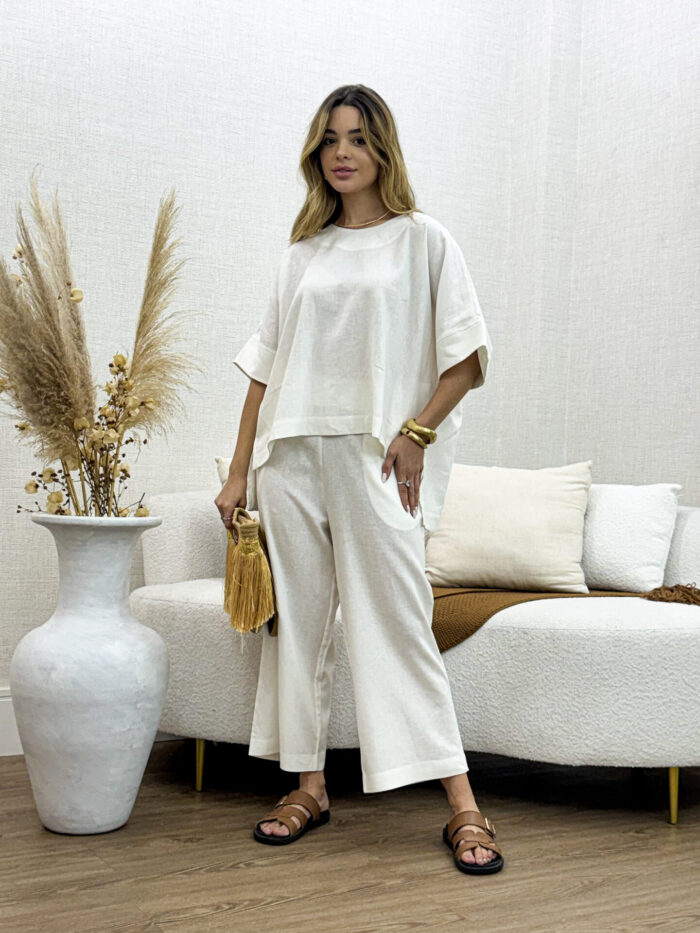 O Conjunto de Blusa e Calça em Linho Nassay une sofisticação e conforto em uma peça versátil e atemporal. Feito em linho leve e de toque macio, o tecido oferece frescor e respirabilidade, perfeito para os dias mais quentes. A blusa de modelagem ampla traz movimento e elegância, enquanto a calça de corte reto com bolsos laterais garante praticidade e um caimento impecável.