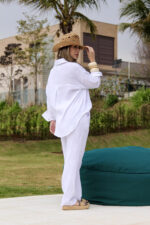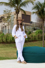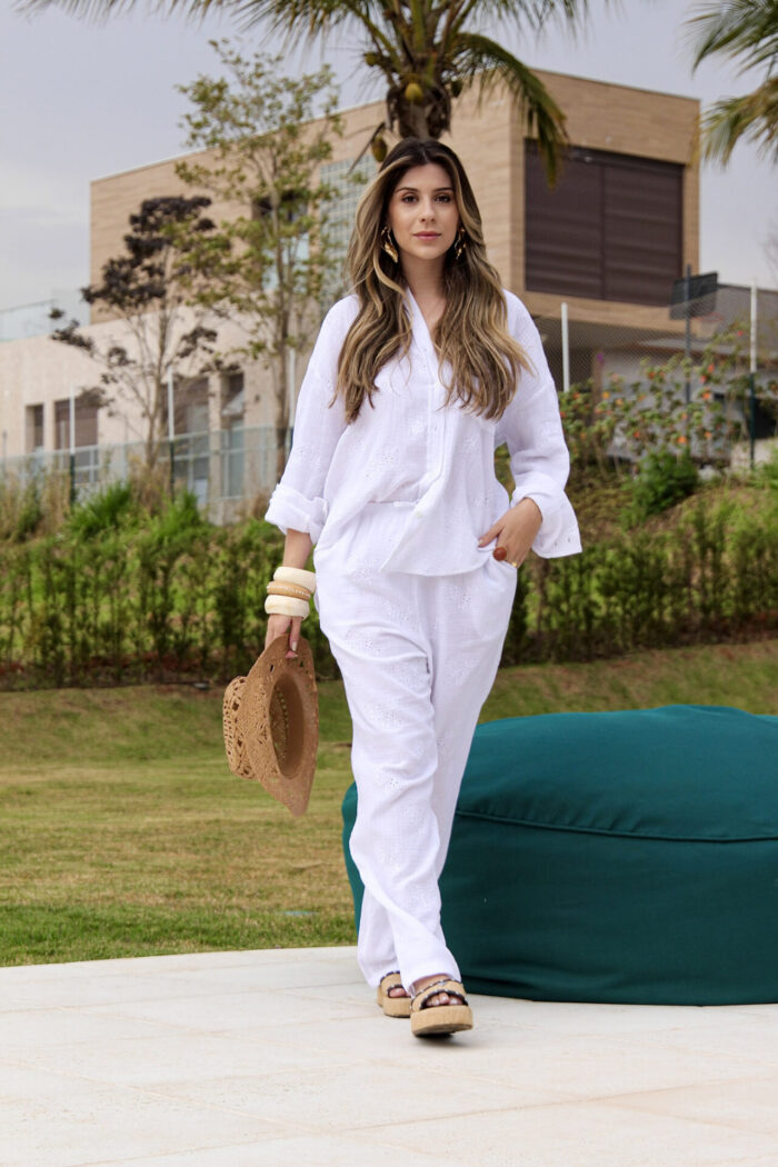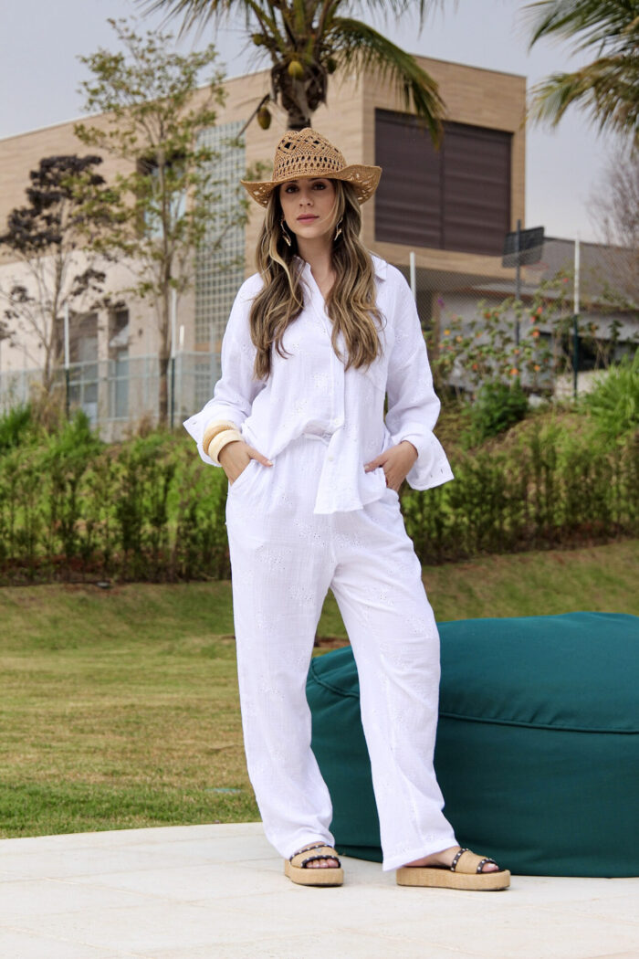 Conjunto em laise composto por calça e camisa confeccionados em tecido leve, fresco e com textura delicada. A camisa possui modelagem soltinha, bolsos frontais e acabamento suave que valoriza os detalhes do tecido. A calça apresenta corte reto, cintura confortável e caimento estruturado que garante elegância e praticidade. O tecido em laise traz um visual sofisticado e ao mesmo tempo despojado, ideal para composições que unem leveza, modernidade e sofisticação em uma peça única.