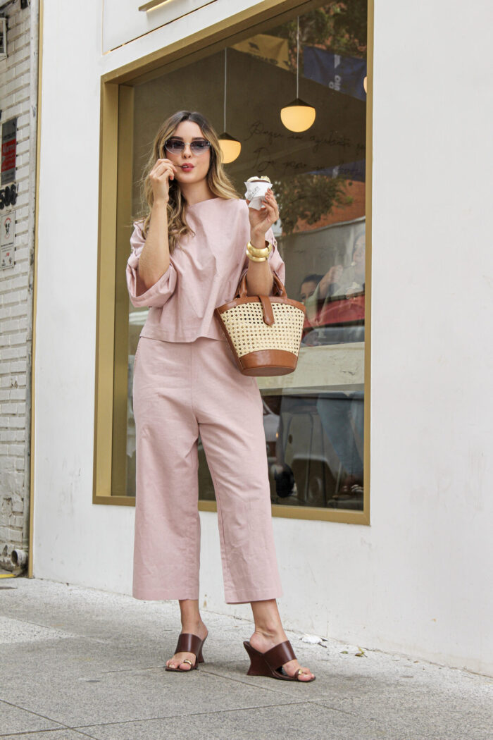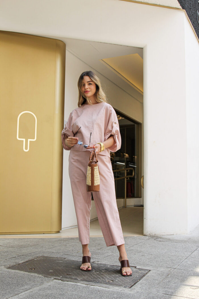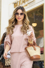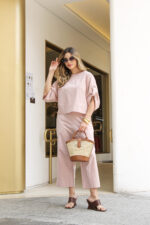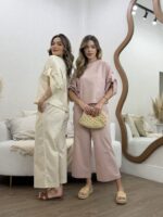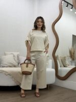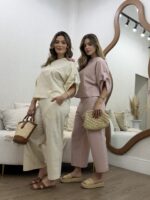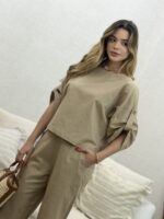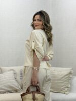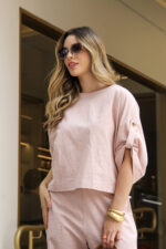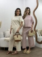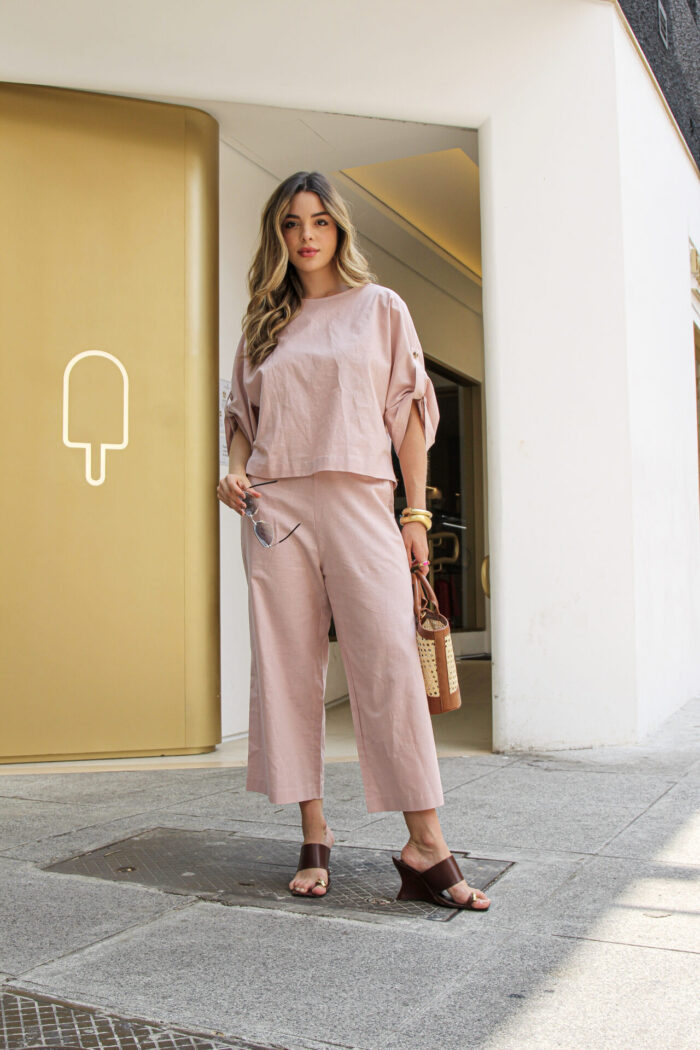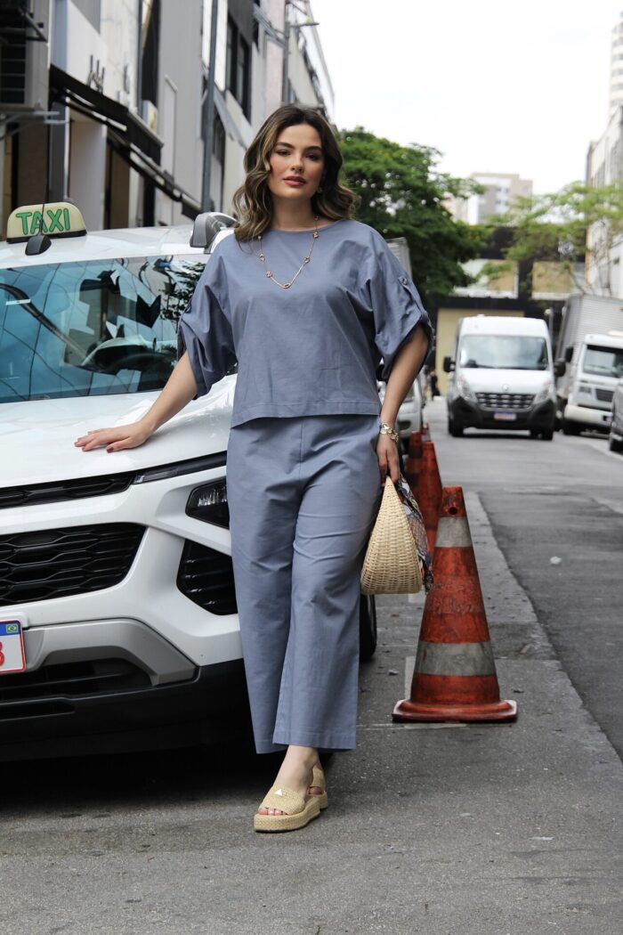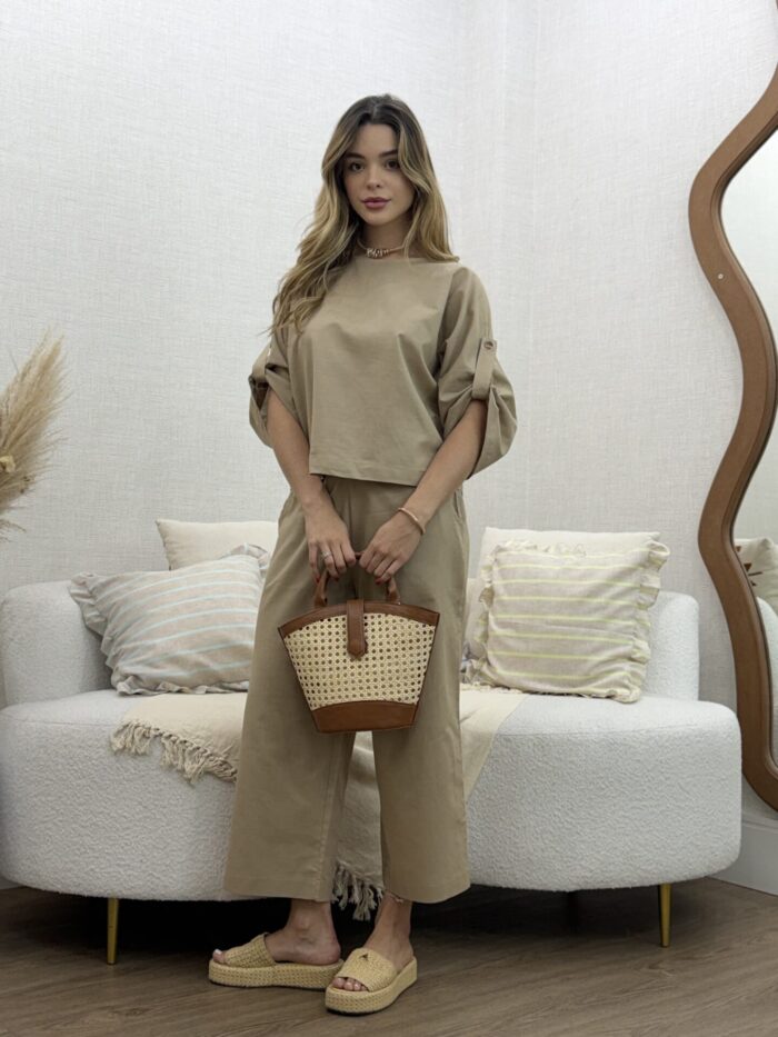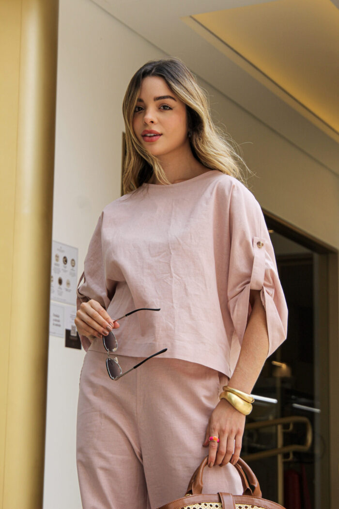 O Conjunto em Linho com Blusa Martingale e Calça une elegância e conforto em uma proposta sofisticada e contemporânea. Confeccionado em tecido de linho, oferece um caimento leve e refinado, ideal para quem busca um visual natural e bem estruturado. A blusa de modelagem ampla traz detalhe de martingale nas mangas, que adiciona um toque de estilo e personalidade, equilibrando modernidade e feminilidade. Já a calça de corte reto e comprimento cropped proporciona um visual clean e alongado, valorizando a silhueta com discrição e elegância.