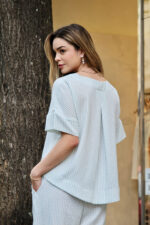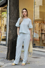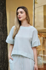 O Conjunto Listrado confeccionado em tecido leve e macio, que garante conforto e frescor. A calça possui cós ajustável com cordão, oferecendo praticidade e ajuste perfeito, enquanto a blusa tem corte reto e caimento solto, valorizando o corpo de forma natural. As listras em tons suaves trazem um visual moderno e sofisticado, ideal para compor looks casuais com elegância.