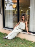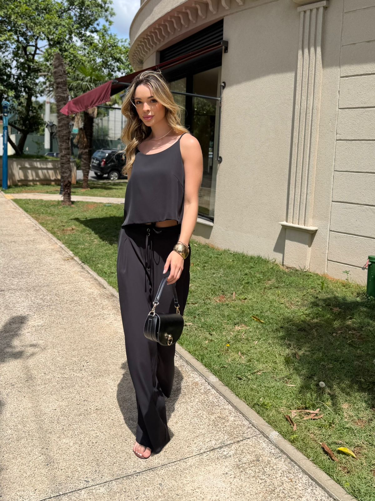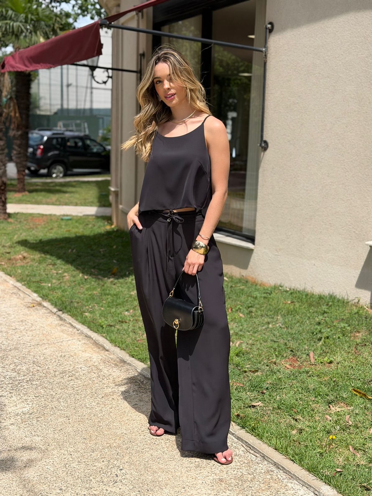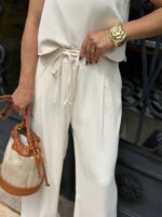 A calça de cintura alta complementa o conjunto com um caimento impecável, alongando a silhueta e oferecendo conforto absoluto graças ao corte amplo e ao ajuste que se adapta ao corpo.
