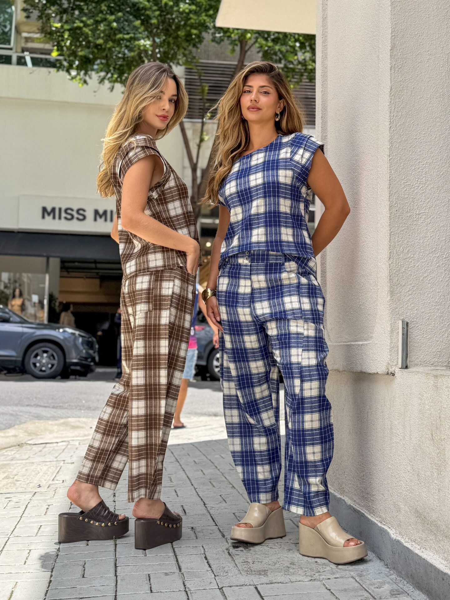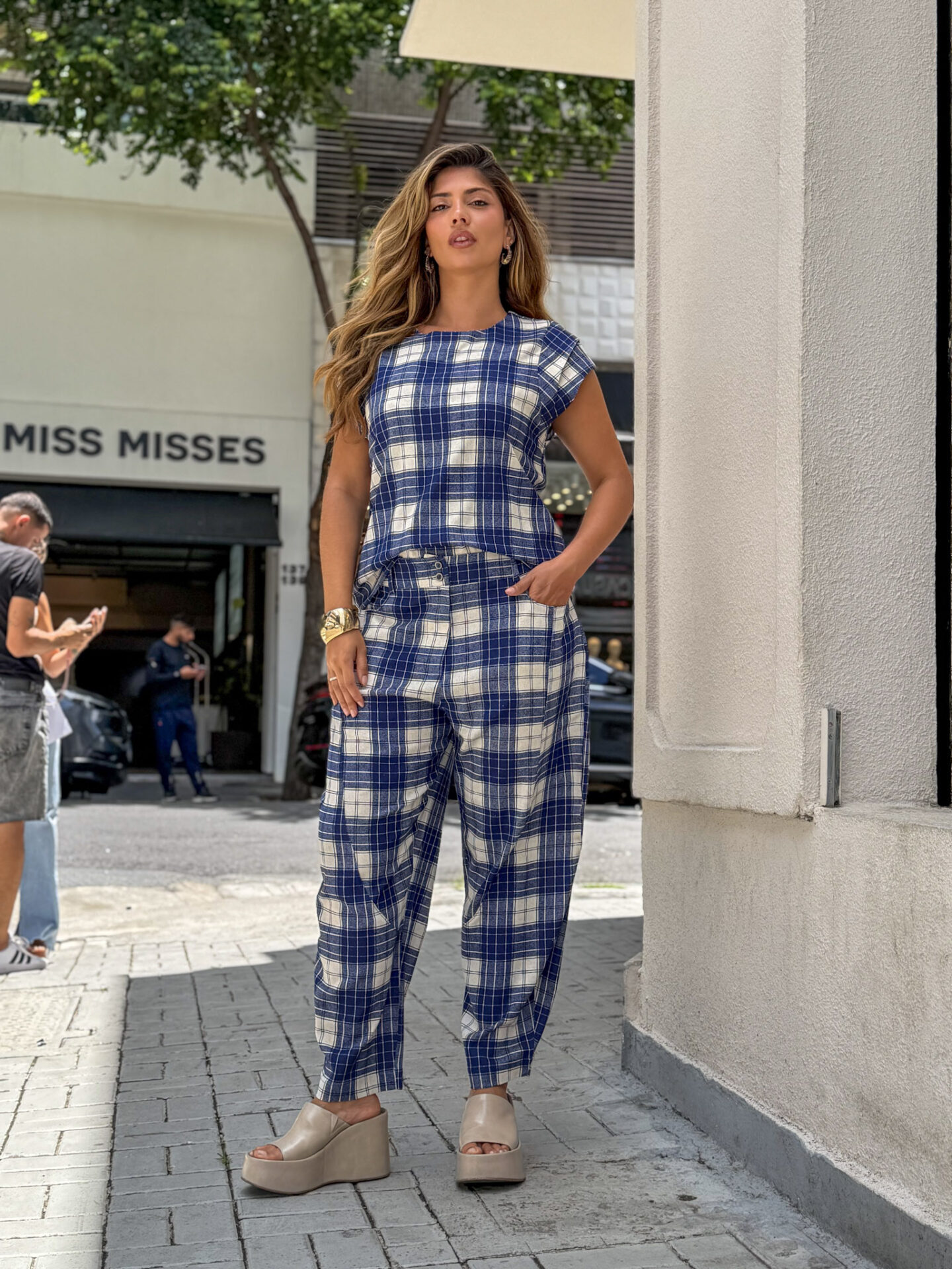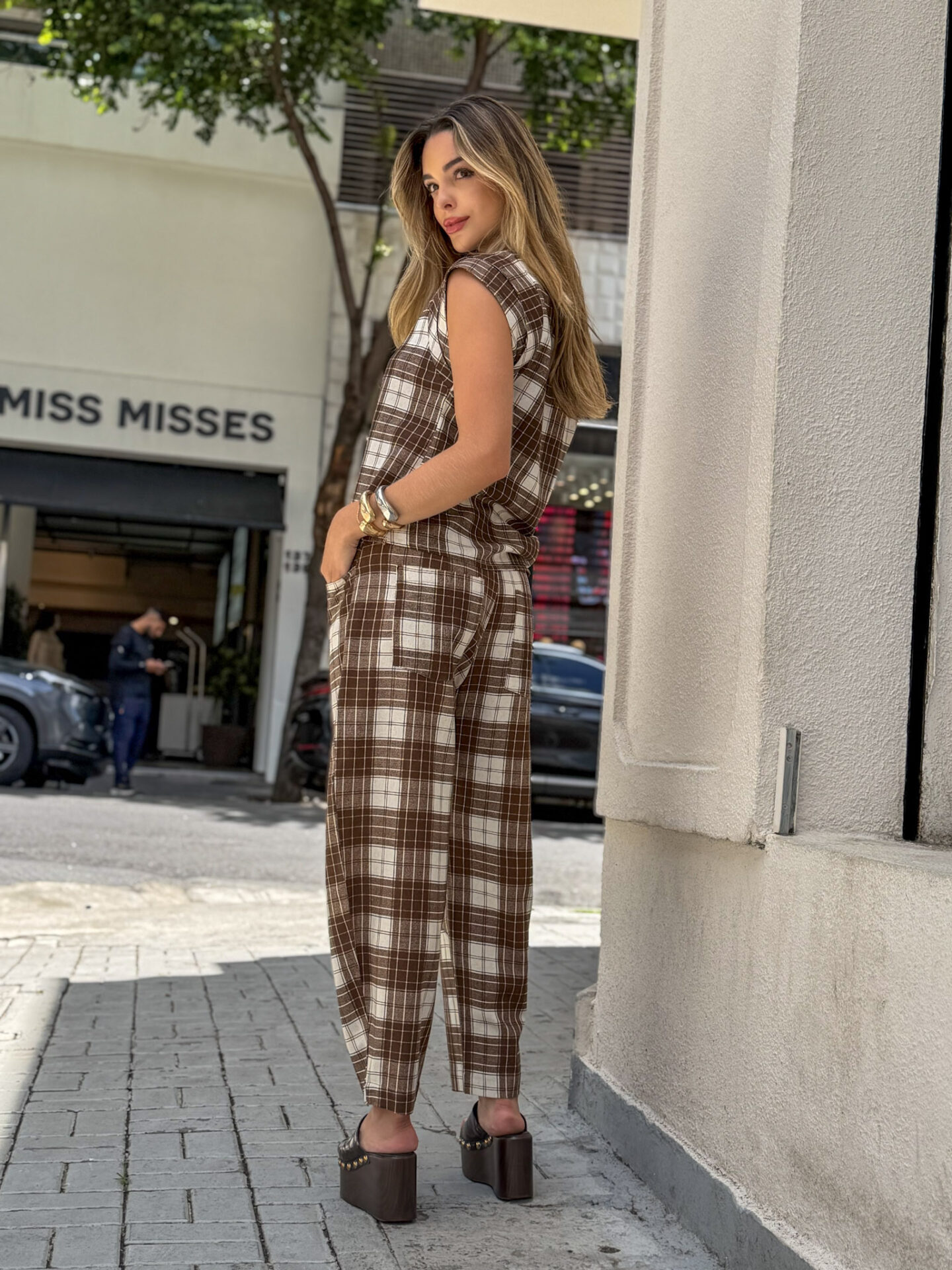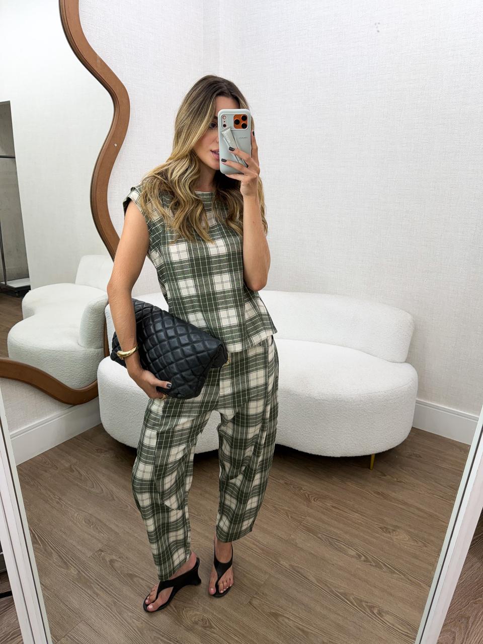 Conjunto Xadrez feminino confeccionado em tecido encorpado e confortável, com excelente caimento e acabamento. A blusa possui modelagem reta, estruturada e moderna, proporcionando ajuste elegante sem marcar o corpo. A calça tem corte alinhado, cintura confortável e comprimento versátil, valorizando a silhueta e garantindo praticidade no uso diário.
