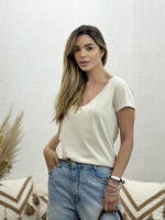 A T-shirt decote V 100% algodão é daquelas peças que não podem faltar no guarda-roupa. Feita em algodão puro, tem toque macio, leve e confortável — perfeita para o dia a dia. O caimento solto valoriza o corpo de forma natural, e o decote em V traz um toque moderno e feminino.