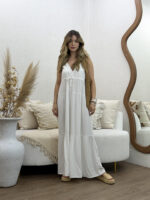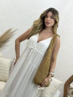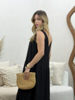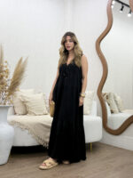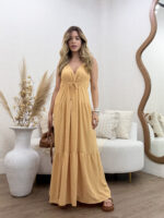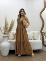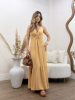 O vestido longo com decote V e amarração na altura do busto é a expressão perfeita de elegância leve e natural. Confeccionado em tecido fluido de toque suave, oferece caimento impecável que valoriza o movimento e garante conforto durante todo o dia. O decote V proporciona um visual alongado e sofisticado, enquanto o detalhe ajustável na região do busto traz um charme delicado e permite melhor adaptação ao corpo.