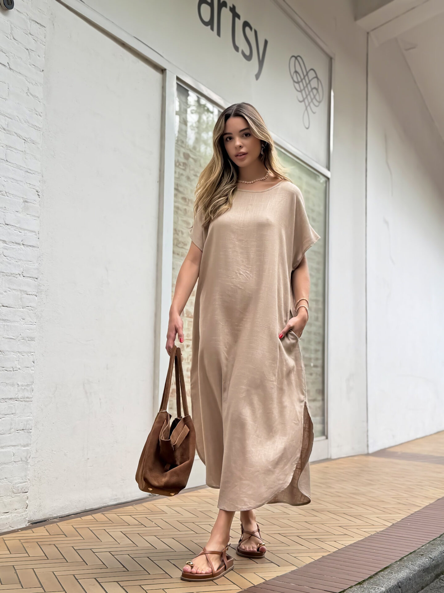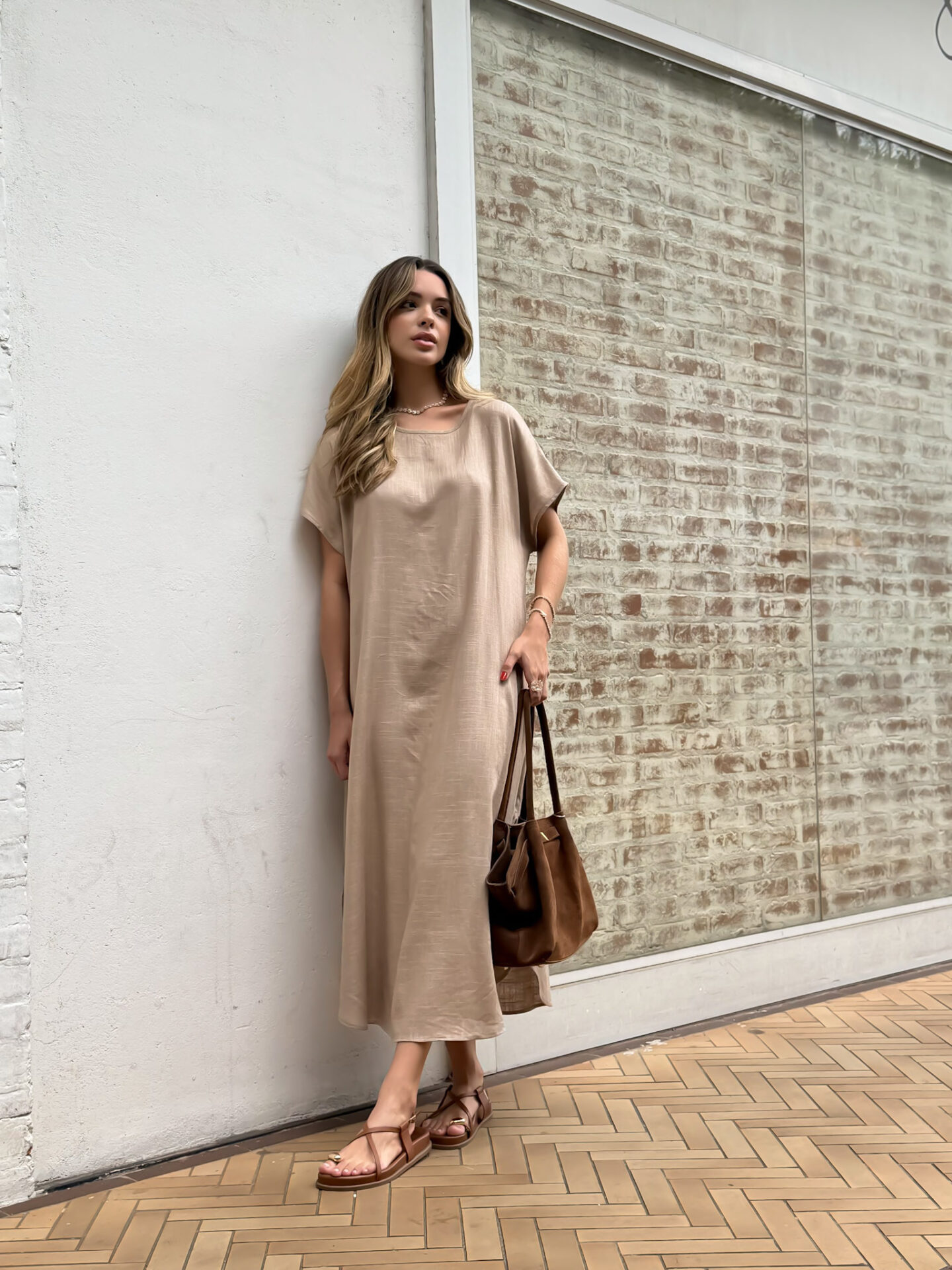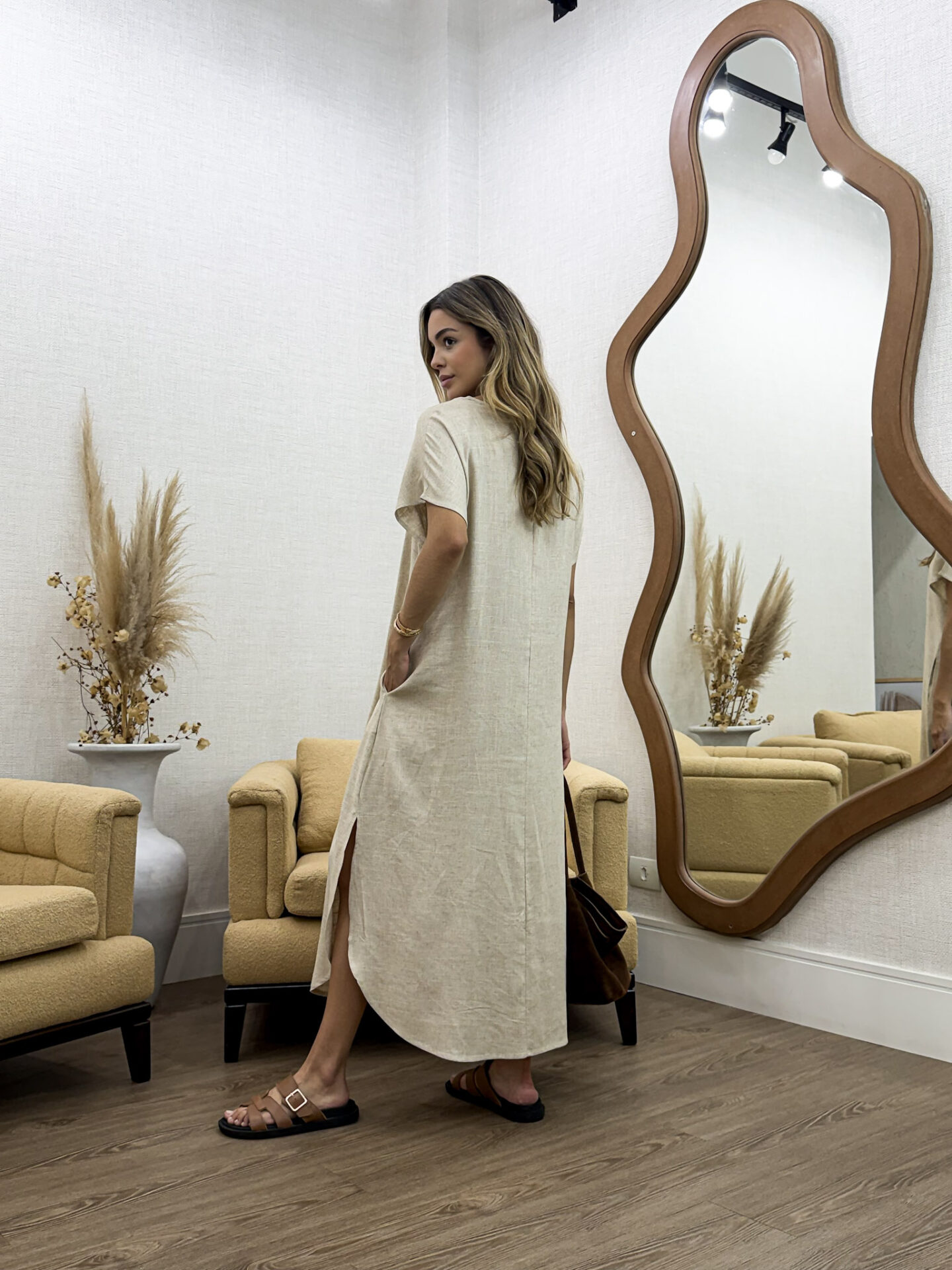 O vestido midi em linho resort é a escolha perfeita para quem valoriza sofisticação aliada ao conforto. Confeccionado em linho de alta qualidade, apresenta modelagem ampla que garante leveza, fluidez e um caimento impecável, favorecendo diferentes tipos de corpo. A fenda lateral acrescenta modernidade e movimento ao visual, além de proporcionar frescor nos dias mais quentes. Com acabamento natural e elegante, o vestido transmite uma sensação de liberdade e confiança, ideal para composições que vão do casual chic ao sofisticado.