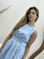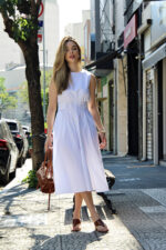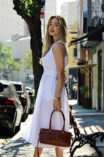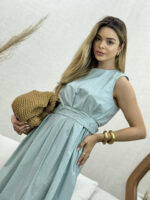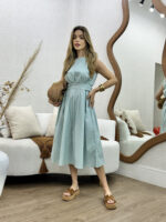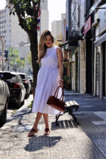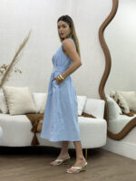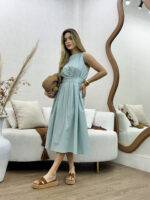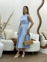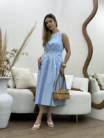 Vestido regata em tricoline, com modelagem midi elegante e detalhe de faixa embutida na cintura que valoriza a silhueta de forma sofisticada. Possui decote nas costas com fechamento em botão, oferecendo charme discreto e moderno. O tecido leve garante conforto e frescor, ideal para compor produções versáteis, do dia a dia a ocasiões especiais.