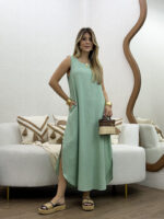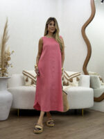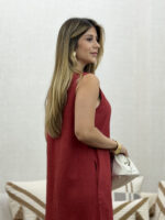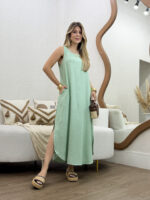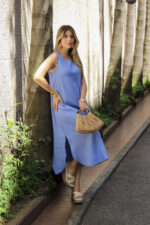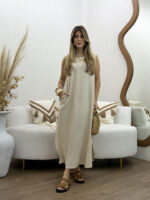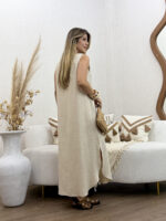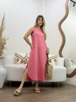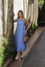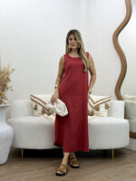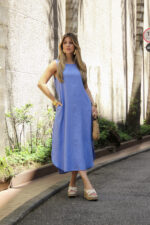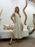 O vestido regata em linho resort combina leveza, frescor e sofisticação em uma peça atemporal. Confeccionado em linho, ele oferece um toque natural e um caimento fluido que valoriza o movimento do corpo com naturalidade. O design minimalista ganha bolsos e fendas laterais, que trazem conforto e modernidade, e com os bolsos laterais, que acrescentam praticidade sem abrir mão da elegância